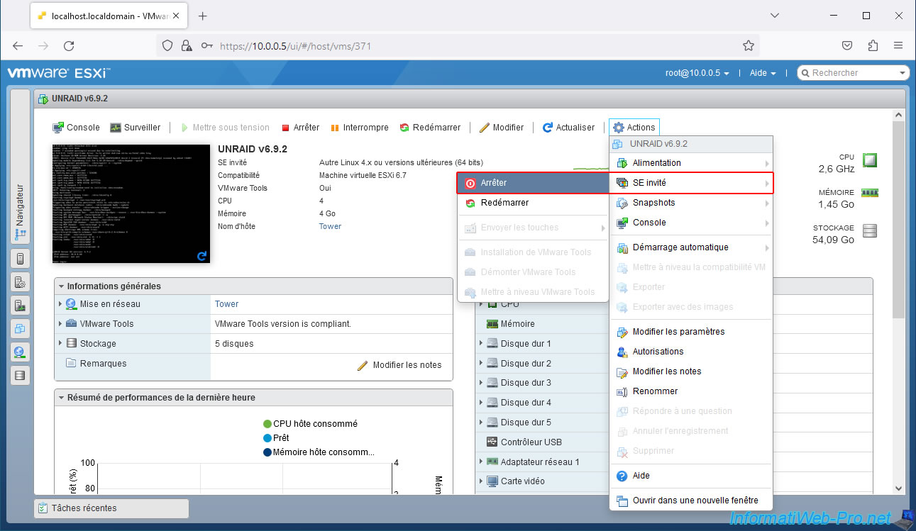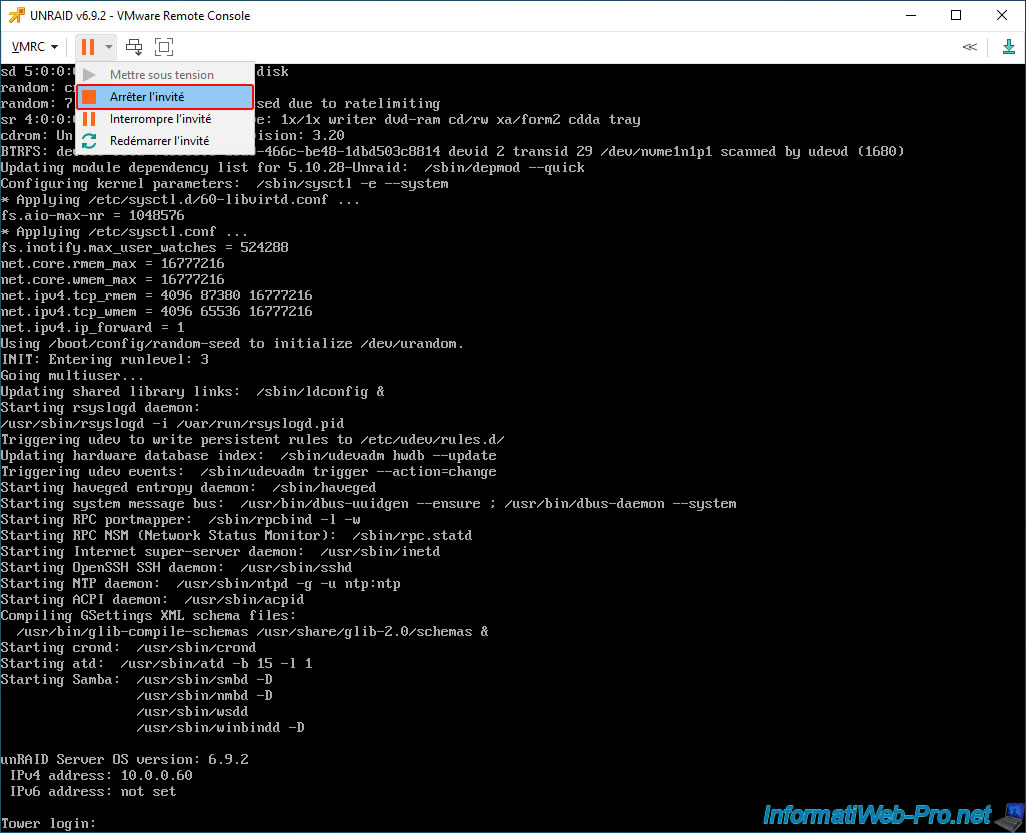 The option to shut down the guest operating system (Unraid) is also located in the "Actions" menu.