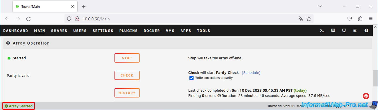Once Unraid has finished booting, you'll see at the bottom of the page that the array started without any issues.