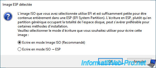 When the "ESP Image Detected" window appears, select the "Write in ISO Image mode (Recommended)" option and click OK.