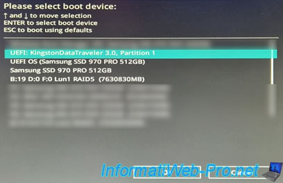 Note: if your USB key appears twice, choose the one beginning with UEFI to boot from it in UEFI mode.