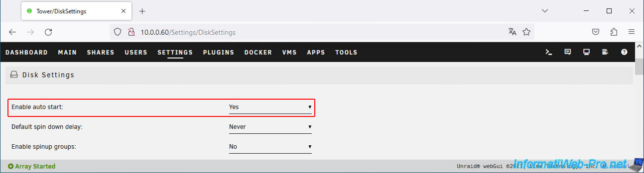 To avoid having to manually start the Unraid array every time, we recommend enabling the "Enable auto start" setting in "Settings -> Disk Settings".