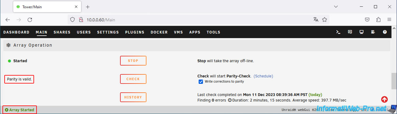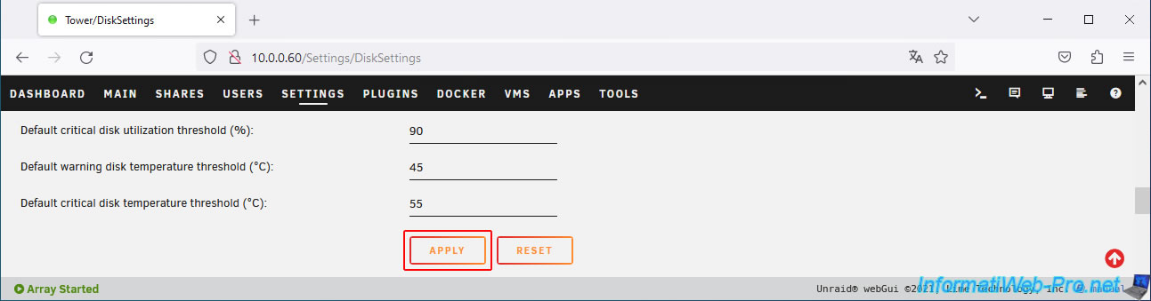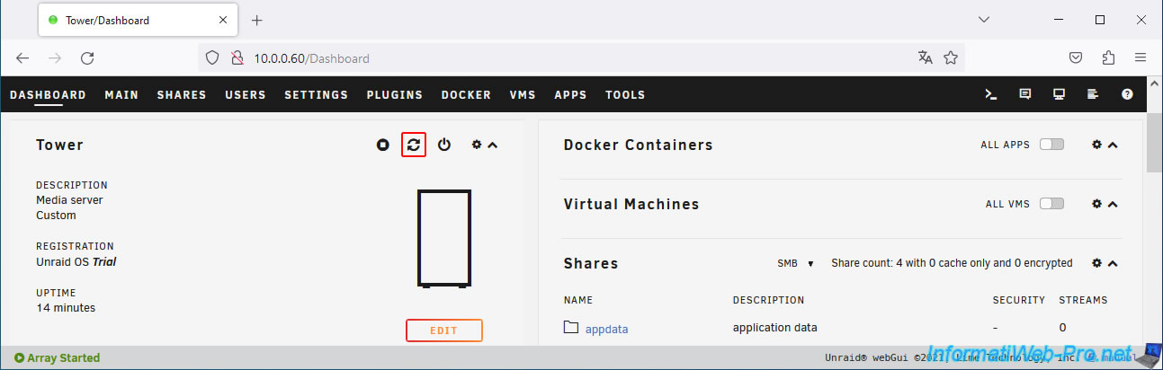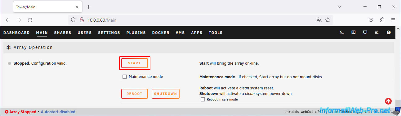 Once your Unraid server has restarted, go to the "Main" tab and click the "Start" button at the bottom of the page.