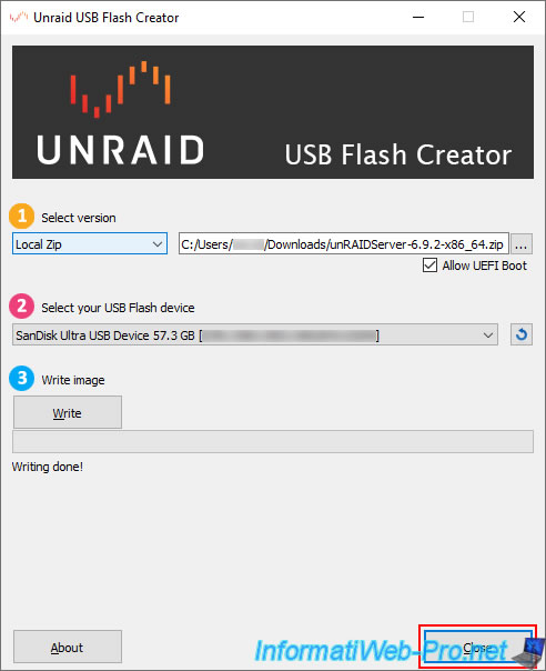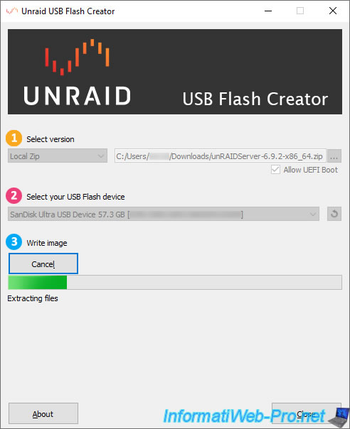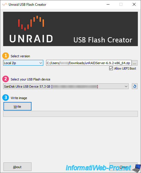 So, we launch the "Unraid USB Flash Creator" tool and select "Local Zip" to use the "unRAIDServer-6.9.2-x86_x64.zip" file previously downloaded from the Unraid website.