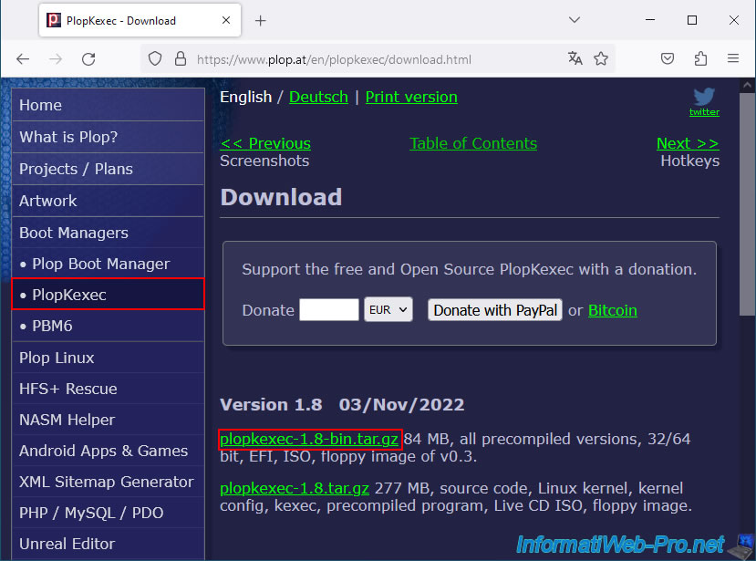 To do this, go to the "PlopKexec - Download" page, then click the "plopkexec-1.8.bin.tar.gz" link to download this tool.