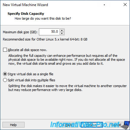 Specify a size for your virtual hard disk and select "Store virtual disk as a single file" (if possible) for better performance.