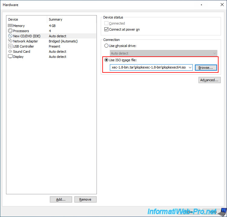 For the virtual CD/DVD drive (New CD/DVD (IDE)):