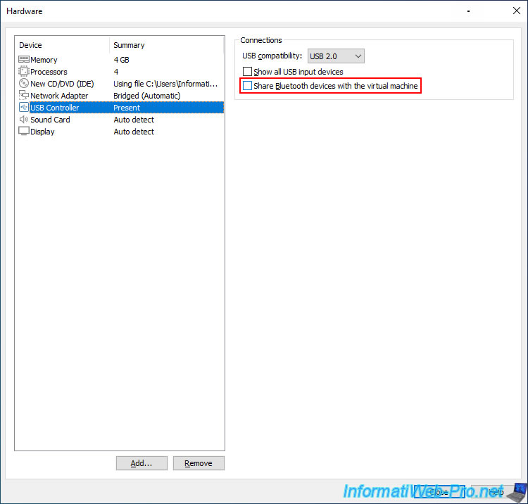 Optionally, for your Unraid virtual machine's USB controller, uncheck the "Share Bluetooth devices with the virtual machine" box to prevent Bluetooth devices connected to your physical computer from being accessible by your Unraid virtual machine.